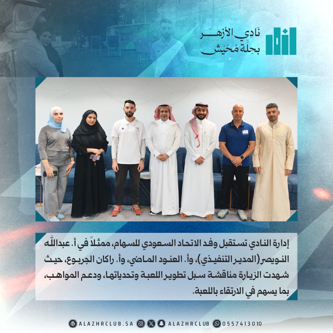 إدارة النادي تستقبل وفد الاتحاد السعودي للسهام، ممثلًا في أ. عبدالله النويصر (المدير التنفيذي)، وأ. العنود الماضي، وأ. راكان الجربوع، في زيارة هدفت للاطلاع على ميدان اللعبة ومرافقها ومناقشة سبل تطوير لعبة السهام.
