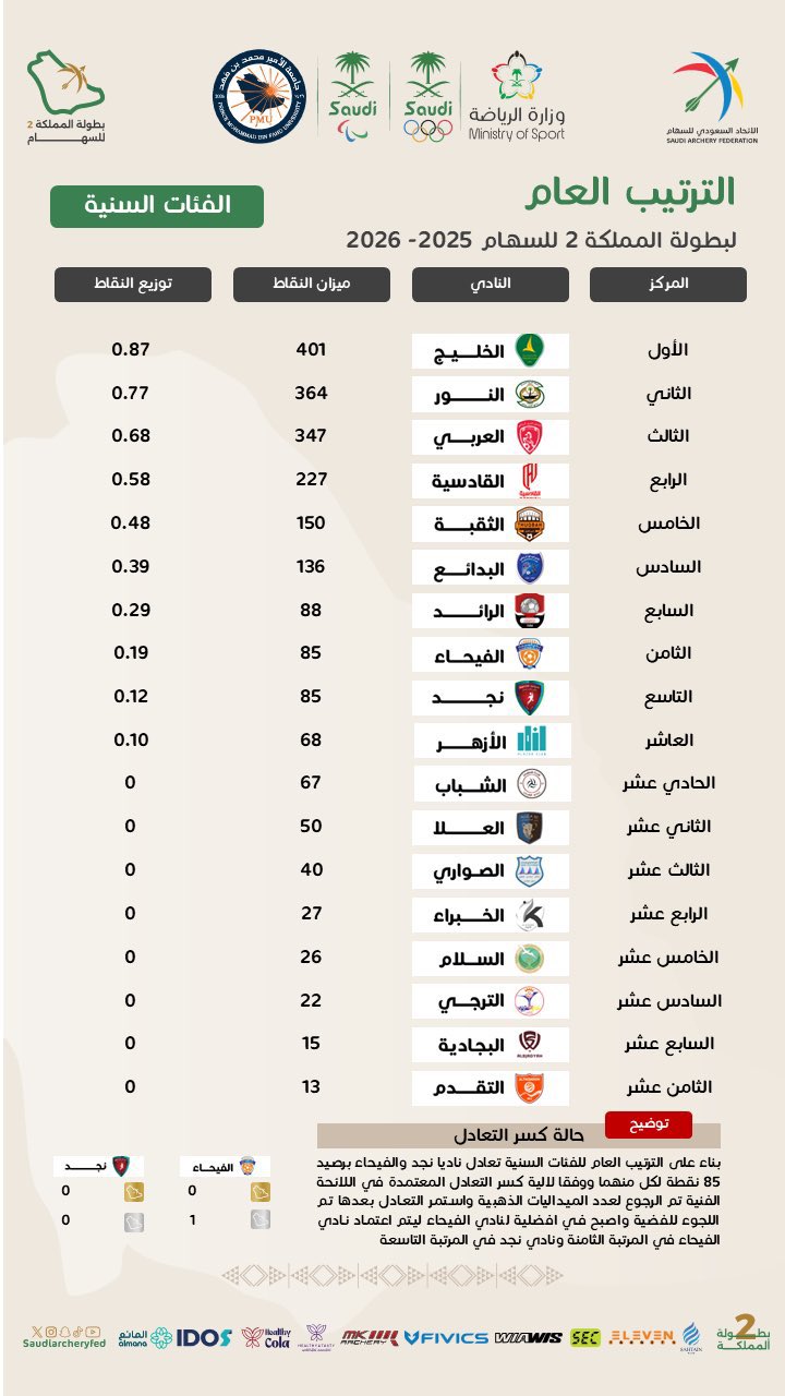 نادي الأزهر يواصل حصد ثمار التخطيط السليم بتحقيق المركز 10 في الترتيب العام لبطولة المملكة 2 للسهام 2025 – 2026..