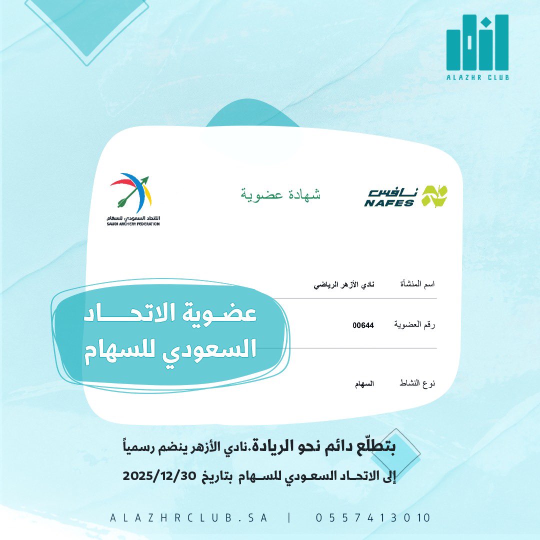 🏹 | أعلن مجلس إدارة نادي الأزهر الرياضي إضافة لعبة «السهام» ضمن منظومته الرياضية، وذلك ضمن رؤية النادي في توسيع قاعدة الألعاب النوعية، علمًا أن النادي أطلق فعالياته ومشاركاته الرسمية مع انطلاق الموسم الرياضي 2024–2025..