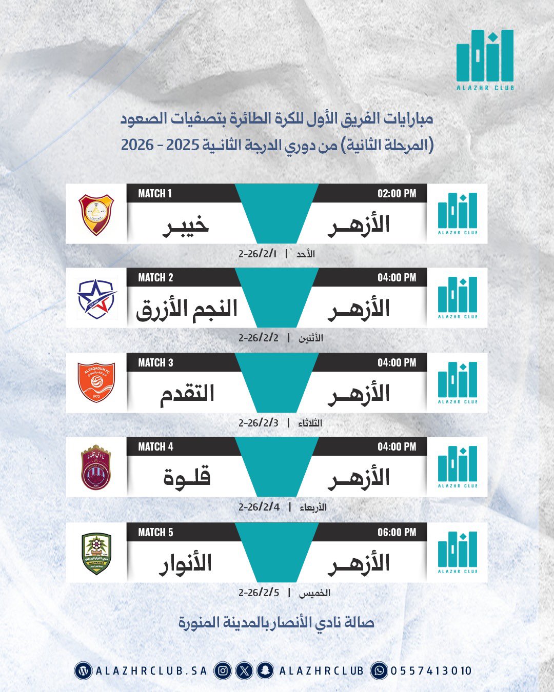 ضمن المرحلة الثانية من تصفيات الصعود، طائرة نادي الأزهر تبحث عن التحليق في سماء المدينة المنورة، وعينها على خطف بطاقة التأهل للمرحلة النهائية..