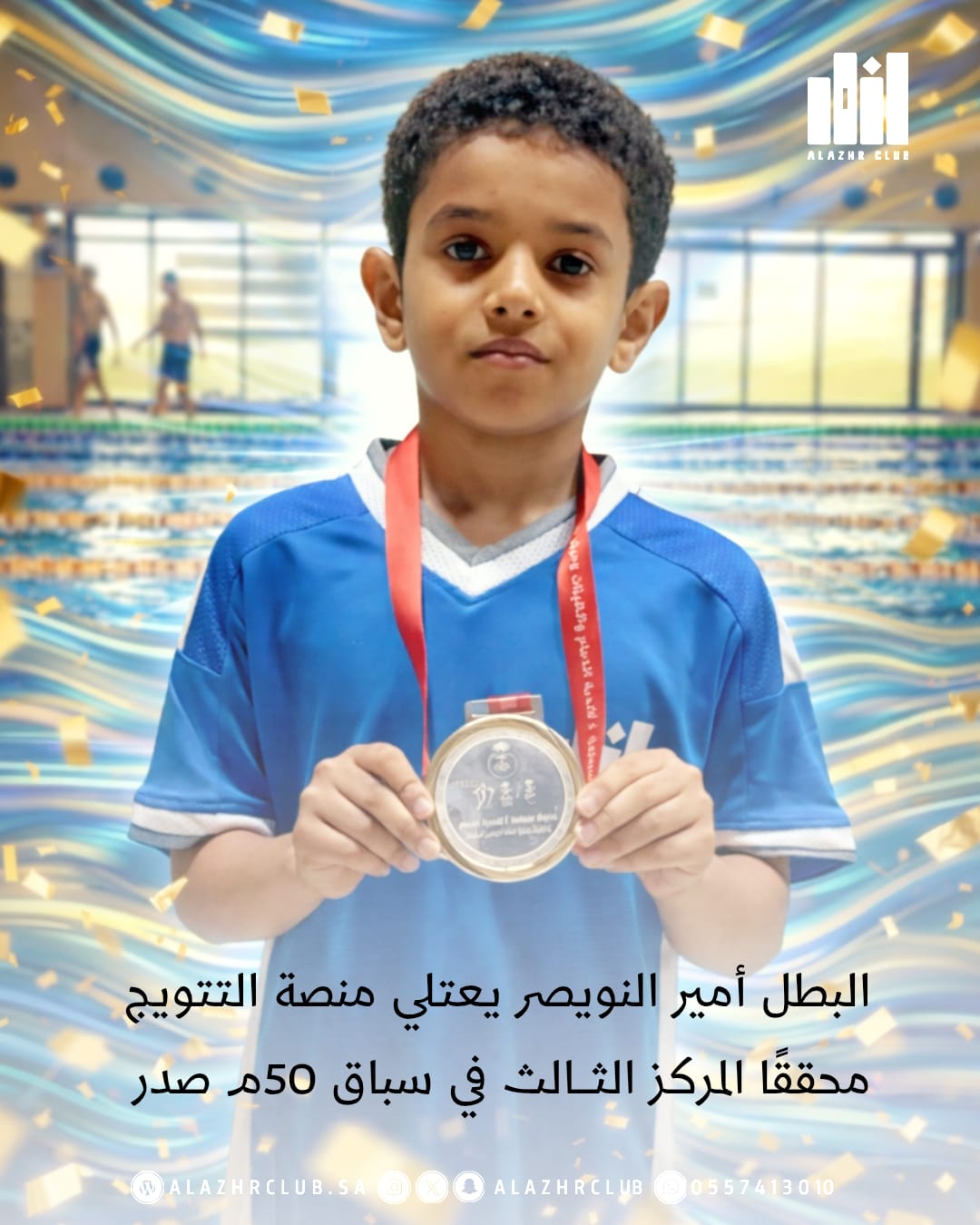 البطل أمير النويصر يعتلي منصة التتويج محققًا المركز الثالث في سباق 50م صدر، بعد سباقٍ قدّم فيه روح المقاتل ولمسة الأبطال.